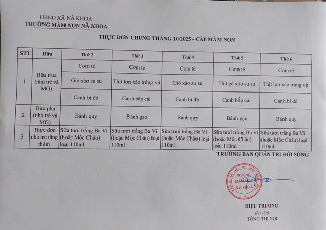 THỰC ĐƠN CHUNG THÁNG 10-2025 CẤP MẦM