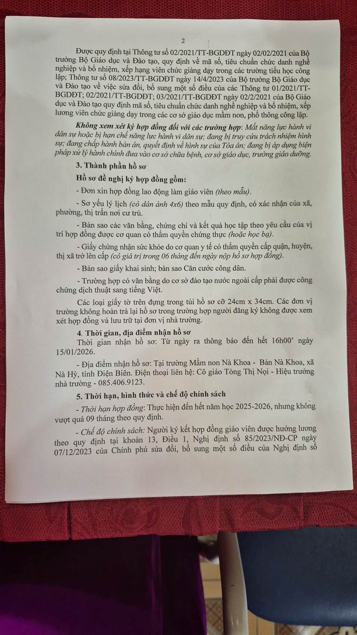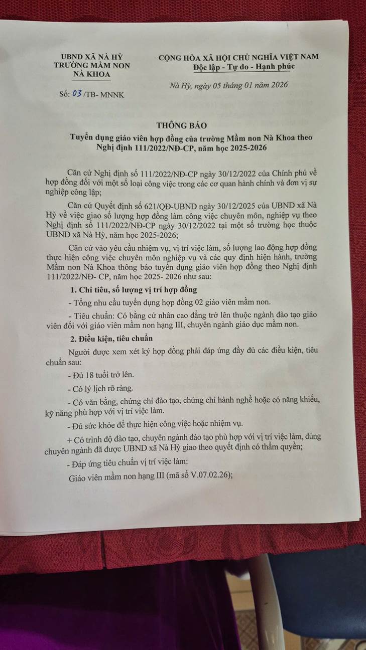 Tuyển dụng giáo viên mầm non Nà Khoa theo nghị định 111/2022/NĐ-CP, năm học 2025-2026