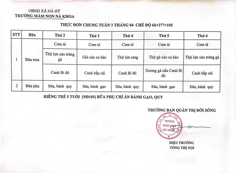 THỰC ĐƠN CHUNG TUẦN 3 THÁNG 04 CHẾ ĐỘ 66+277+105